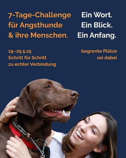 In meiner begleiteten 7-Tage-Challenge zeige ich dir, wie du mit Sicherheit, Gefühl und einem klaren Signal das Vertrauen deines Hundes gewinnst.